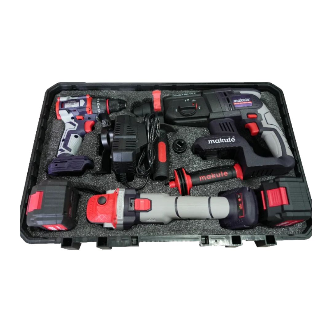 Pack d’outils sans fil Makute comprenant : une meuleuse d’angle (CAG126), une perceuse à percussion (CHD001) et une perceuse à percussion/visseuse à choc (CID121-10). Livré avec 2 batteries 4000 mAh et un chargeur. Parfait pour les travaux de bricolage et les projets professionnels, offrant mobilité et puissance sans fil.